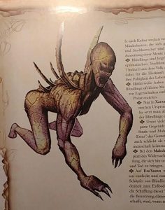 Der Zeitmangel hat aber auch gute Seiten. Wenn ich weniger Zeit für Vorbereitung habe, muss ich eben Zeit sparen. Und das klappt gut, indem ich mir Inspiration oder sogar Vorlagen aus anderen Werken hole. In diesem Fall betrifft das die Kreaturen mit der Steinhaut, gegen die die Spieler kämpften. Dabei handelt es sich um “Blindlinge”, eine Kreatur aus dem Buch Myranische Monstren.