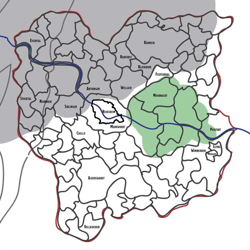 Ich habe vor einer Ewigkeit, ich glaube nach Folge 4, mal eine grobe Karte des Königreichs Novakrim angefangen. Wie das immer so ist, habe ich sie nie fertig gestellt und nie aus dem Schrank geholt. Der Schauplatz unserer Abenteuer, Reiksheim, ist in der Mitte des Reichs angesiedelt, umgeben von kleineren und größeren Grafschaften. Der Varkslauf durchläuft das ganze Königreich von Nordwesten nach Osten. Der große grüne Klecks ist das Moor und der graue Fleck die eventuelll mal erwähnte Berglandschaft.