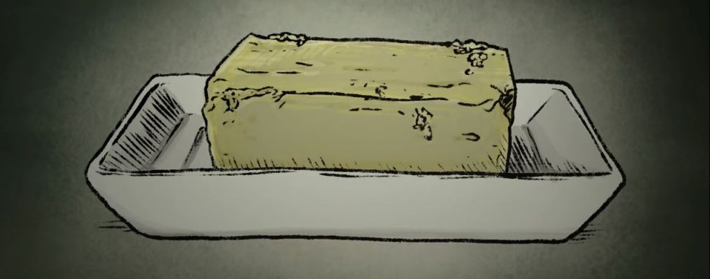 Auch die bereits aus vergangenen Abenteuern bekannten Schlüsselgegenstände waren wieder mit dabei, wenngleich in spärlicher Zahl. Nennen wir es “dezent” und passend. Ebenso das Rätsel, welches Simon gleich lösen wollte. Und überraschenderweise auch souverän konnte. Nicht, dass ich es ihm nicht zugetraut hätte, aber war trotzdem interessant zu sehen, wie der Lösungsgedanke durch seinen Kopf ging und sich sein Gesicht erhellte. Soweit, so logisch. Bis zu diesem Gegenstand, der sofort mehrere Fragen aufwirft - das Stück ranzige Butter.