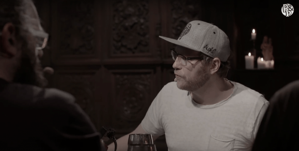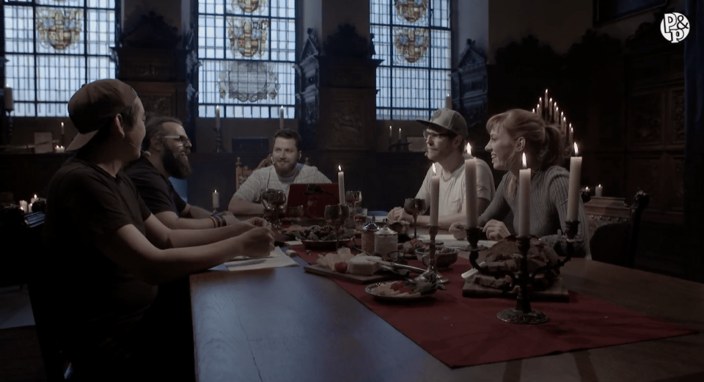 Werfen wir einen Blick auf die Optik, denn noch bevor die ersten Worte gesprochen wurden, gab es eine unwesentliche Verzögerung, in der der Spieltisch aus der Vogelperspektive gezeigt wurde - überlagert vom Titel des Abenteuers. Das Titelbild ist sehr simpel, passt aus meiner Sicht aber zum Setting. Ebenso das “Studio”, denn aufgenommen und gespielt wurde diesmal im Kapitelsaal des Doms in Münster. Eine tolle Kulisse, auf ihre Art ähnlich eindrucksvoll wie zu “Der schwarze Tod”. Der Tisch wurde passend dekoriert wie gewohnt mit Brot, Käse und Wurst bestückt. Bei den Gläsern bin ich unsicher, es sieht nach Weinkelchen und Bierhumpen aus. Einen starken Kontrast dazu waren die Spieler. Ich bin mir wirklich unsicher, ob ich lieber passendere Kleidung gesehen hätte, oder ob ich gerade diesen lässigen Look gut finde. Unter “passende Kleidung” verstehe ich übrigens keine Kostüme, sondern eher neutrale Kleidung, die weniger “modern” wirkt. Aber je mehr ich das ganze in Aktion sehe, desto mehr komme ich zu dem Schluss, dass ich es gut so finde, wie es ist. Es unterstreicht noch mehr, dass es sich um ein Spiel handelt, das in den Köpfen der Teilnehmer stattfindet. Sie wirken, als wenn sie nicht an diesen Ort gehören und sind doch im Fokus.
